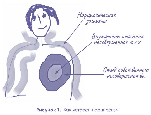 Все мы несовершенны, это естественно. Но человек с ярко выраженными нарциссическими чертами настолько сильно влюблен в этого не существующего в реальном мире идеального себя, что малейший недостаток, по ощущению нарцисса, искажает, порочит и замутняет совершенство того идеала, который он страстно обожает. Поэтому, когда нарцисс замечает собственные несовершенства и ограничения, его охватывает глубокий, непереносимый стыд. Нарцисс не может выносить сам себя — такого, какой он есть в реальности. Он стыдится себя-настоящего и любит только себя-идеального.