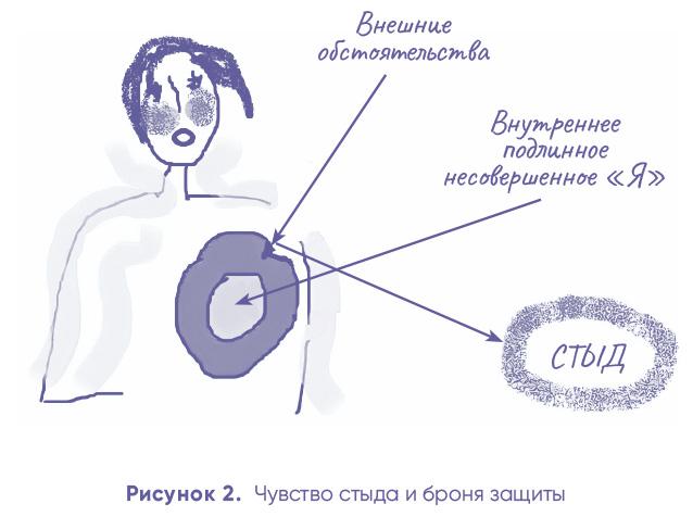 На рисунке мы видим внутреннее несовершенное подлинное «я», которое находится у нарцисса так глубоко, что оно недоступно ему, он может о нем даже не подозревать. К подлинному «я» мешает пробиться стыд собственного несовершенства. И, наконец, снаружи — блестящая броня, «идеальное отражение», которое нарцисс считает собой и предъявляет другим.