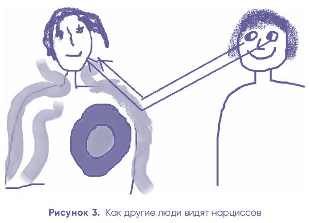 На рисунке видно, что внутреннее подлинное «я» остается недоступным для человека с нарциссическим характером, поэтому у него нет собственных критериев самооценки. Другие люди, их похвалы, признание заслуг — это и есть то зеркало, в которое глядится нарциссический человек. Он должен постоянно получать от других прямые или косвенные подтверждения того, что хорош. Это для него жизненно важно.