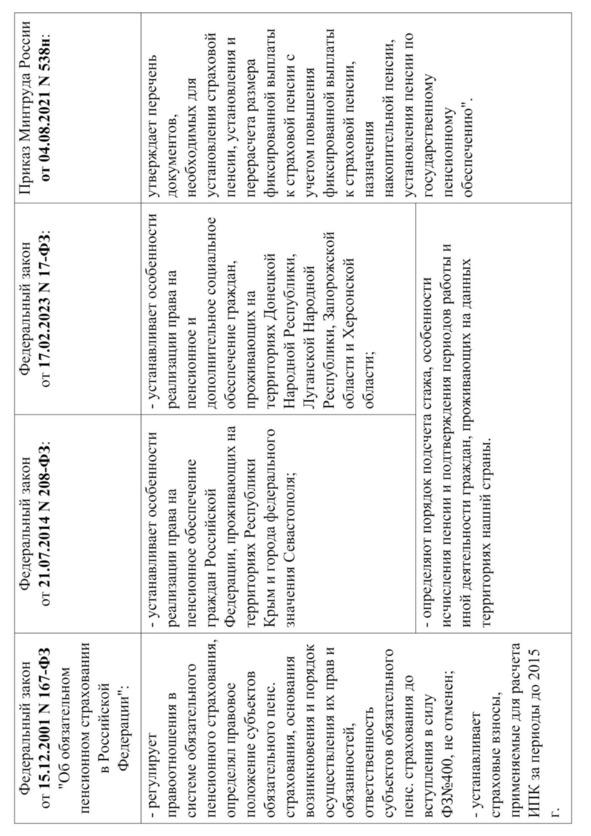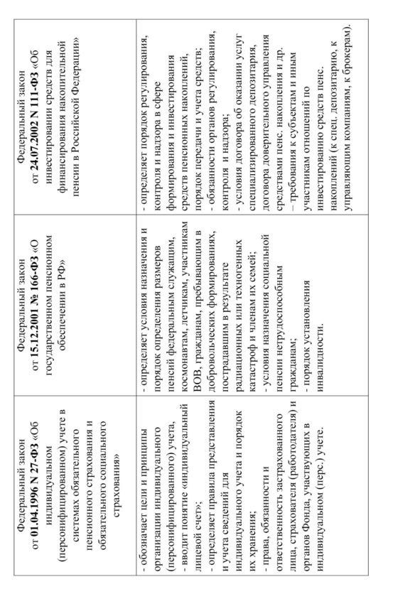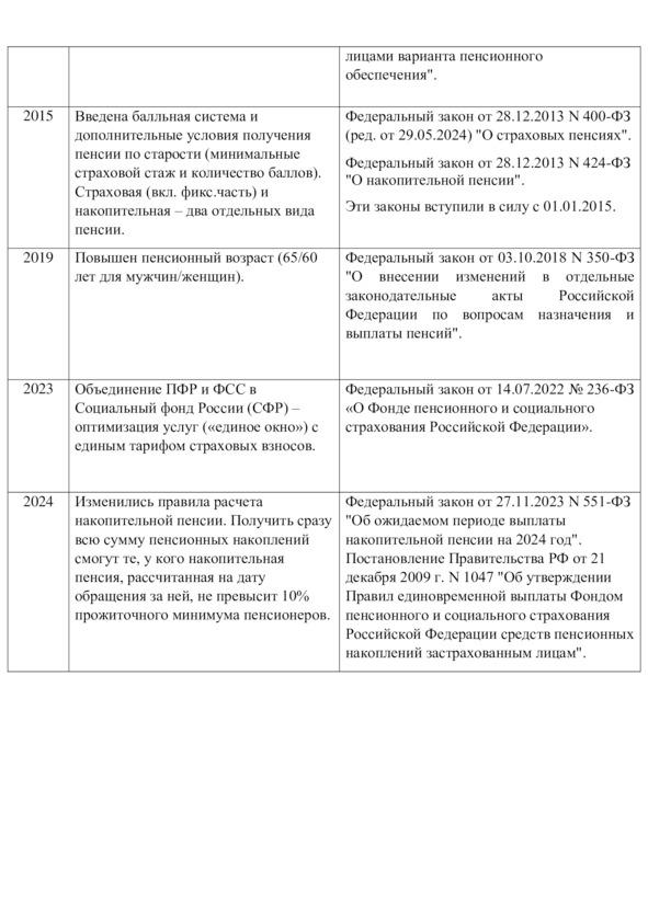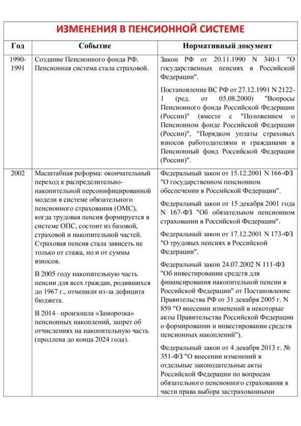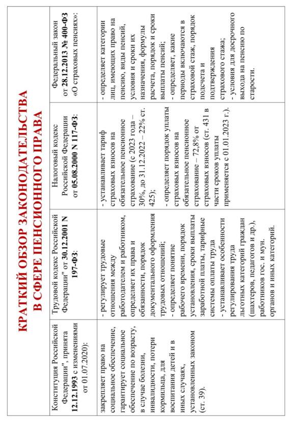 Основные изменения в пенсионной системе России, а также краткий обзор законодательства, регулирующего сферу пенсионного права, приведены в соответствующих таблицах.