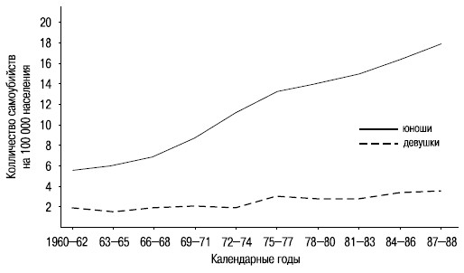 В возрасте 15–19 лет у юношей коэффициент смертности в 2 раза выше, чем у девушек. Кроме болезней и травм большой вес занимают самоубийства: среди девушек, по данным международной статистики, их значительно меньше, чем среди юношей (рис. 3.1).