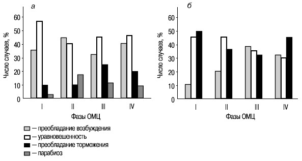 Сила нервной системы в различные фазы ОМЦ существенных и закономерных изменений не претерпевает.