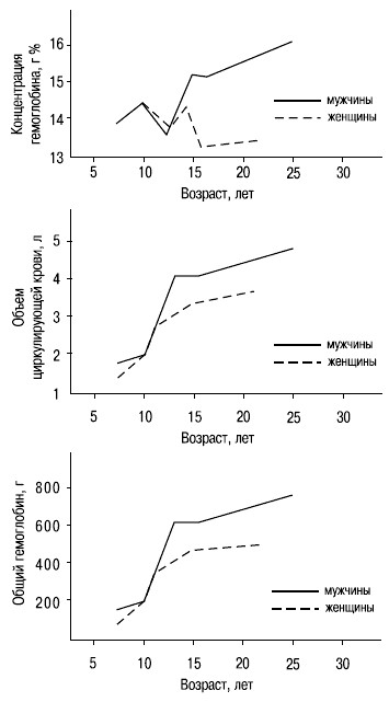 В середине менструального цикла начинает уменьшаться концентрация эритроцитов, гемоглобина, лейкоцитов, тромбоцитов, а также белков в крови, что связано с некоторой гемодилюцией – увеличением объема плазмы крови, вызванной задержкой солей и воды в теле. Непосредственно перед началом менструации содержание эритроцитов и гемоглобина в крови нарастает. В дни менструации происходит потеря эритроцитов и гемоглобина, что приводит к снижению кислородной емкости крови. Понижается и свертываемость крови как результат уменьшения числа тромбоцитов и активности фибринолитической системы. Однако кровопотери, как считают, имеют и положительное значение, поскольку могут быть физиологическим раздражителем для последующего усиления эритропоэза – выработки новых эритроцитов. Насколько это мнение оправданно, сказать трудно, так как исследования показали, что потери женщиной крови в период менструации невелики – около 25 мл. Примерно к середине менструального цикла кислородная емкость крови достигает максимума.