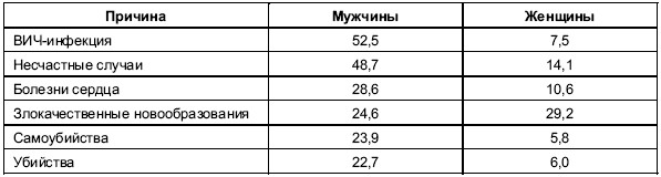 Основные причины смерти. Данные, представленные в табл. 3.4 (заимствовано из: Крайг Г., 2000), дают приблизительное представление о половых различиях в основных причинах смерти мужчин и женщин 25–44 лет, касающихся высокоразвитых стран Запада.