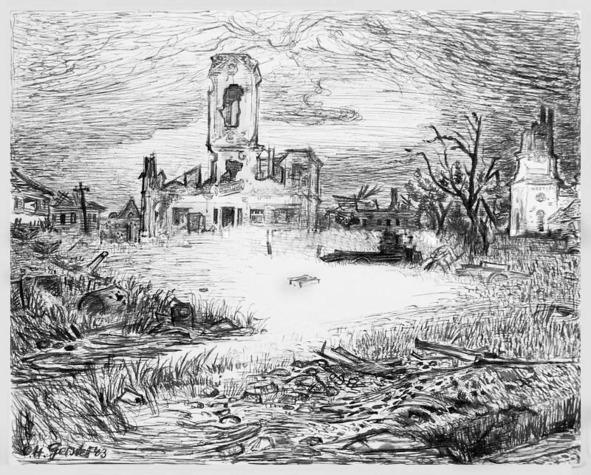 Я снял ранец и достал из него свою знаменитую коробку. Вытащив рисунки, которые успел набросать в минуты фронтового затишья, я веером разложил их на столе. Затаив дыхание я замер в ожидании похвал. Мне хотелось услышать, что скажут о моем творчестве эти парни из дивизионной разведки. Камрады обступили меня, рассматривая рисунки. В подвале наступила гробовая тишина. Образы убитых людей. Свирепые лица солдат в условиях рукопашного боя. Раненые люди: без рук, без ног. Все это стало для моих новых однополчан настоящим шоком.