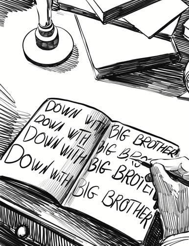Взявшись за ручку двері, Вінстон побачив, що залишив щоденник відкритим на столі. «Геть Старшого брата» було написано всюди, причому такими великими літерами, що розібрати написане можна було з будь-якої точки в кімнаті. Це було неймовірно безглуздо з його боку. Але навіть у паніці він не хотів забруднити кремовий папір, закривши записник, коли чорнила ще були вологими.