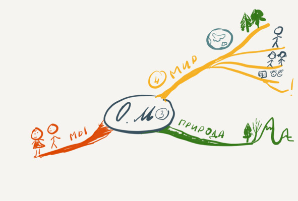 Кто из вас сейчас может вместе со мной это сделать? Давайте проверим друг друга. Я сейчас нарисую эту схему, не обращаясь ни к каким источникам. Итак, «Окружающий мир», 3 класс. Там было три раздела. Первый — глобус, мы изучали «Мир». Второй — «Природа». Третий — «Мы», человечество.