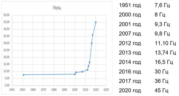 Вибрации нашей Земли многие столетия колебались в пределах 6—8 Гц. И за короткий срок вдруг начали ускоряться. Исследования ученых показали, что на стыке тысячелетий, в январе 2000 года, произошел серьезный скачок вибрации и они понеслись просто в бешеном ритме. По шкале Шумана 2001 год — 9,3 Гц, а в январе 2020 г. измерения показали уже 45 Гц! Что же происходит? Глобальная катастрофа? Нет. Давайте разберемся, посмотрите на таблицу.