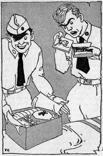 For dinner we had roast chicken and sweet potatoes and cream corn and biscuits and coffee and for supper they was bake beans with tomato sauce and bread and pudding and cake and coffee and the grub is pretty fair only a man can't enjoy it because you got to eat to fast because if theys anything left on your plate when the rest of them birds gets through you got to fight to keep it from going to the wrong address. Well Al its pretty near time for the tattoo buggle which means the men has got to shut up and keep quiet so I am going to get ready for bed but I don't know if I would rather have them keep quiet or not because when they are keeping quiet you don't know what they are up to and maybe they are snooping a round somewheres waiting for a man to go to sleep so they can cut your throat. Some of them has been use to doing it all their life Al and they are beggining to miss it. But I don't know if I wouldn't just as leave die that way as from them upseting exercises.