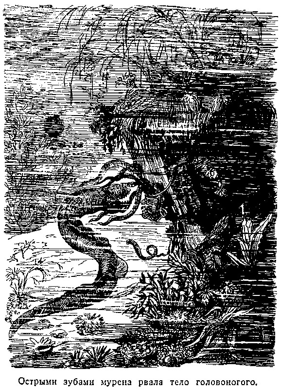 Голова кашалота была уже вся оплетена толстыми руками осьминога. Они то отделялись от нее, и тогда клочья кожи, вырываемые присосками, разлетались в стороны; то вновь прилипали к телу врага, сжимая его. Одна из рук осьминога — длинная, десятиметровая змея — попала в раскрытую пасть кашалота и, как будто отрезанная ножницами, извиваясь в конвульсиях, медленно опустилась на дно.