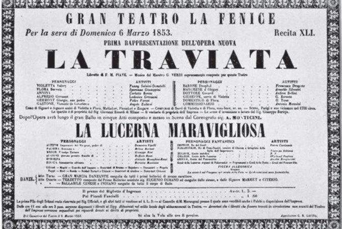 Как известно, Верди с первой исполнительницей роли Виолетты не повезло. Фанни Сальвини-Донателии была незаурядной и очень просвещённой по тем временам женщиной. Она, в частности, успешно переводила на французский язык либретто опер Верди – любопытно, знал ли он об этом? Но для роли юной девушки, умирающей от чахотки, не очень красивая и весьма дородная примадонна, вдобавок обладавшая как на грех очень лёгким голосом, ну никак не подходила. И уж вовсе не стоило ей изображать на сцене чахоточный кашель – публика хохотала от души!
