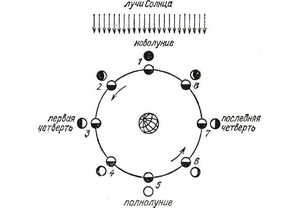 Когда Луна при своем движении вокруг Земли окажется между Солнцем и Землей (положение 1), то к Земле будет обращена ее неосвещенная часть и в этом случае с Земли она не будет видна. Такая фаза Луны называется новолунием. Если Луна окажется в положении прямо противоположном Солнцу (положение 5), то часть ее, обращенная к Земле, будет полностью освещаться Солнцем, и Луна будет видна с Земли в виде полного диска. Эта фаза Луны называется полнолунием. Когда Луна окажется в положении 3 или 7, то в это время направления на Солнце и Луну составят угол в 90° и поэтому с Земли будет видна только половина ее освещенного диска. Эти фазы Луны называются соответственно первой четвертью и последней четвертью [4].