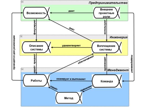 Как мы помним, любые понятия — это самые маленькие модели мира. Но есть модели, которые связывают разные понятия между собой. Модели или схемы системного мышления могут связывать разные понятия и модели других дисциплин между собой. Например, системная схема проекта (см. картинку) связывает понятия из системного предпринимательства, системной инженерии и системного менеджмента.