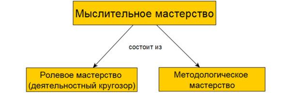 В мыслительном мастерстве задействуется ролевое мастерство и методологическое мастерство. Ролевое мастерство помогает выявить заинтересованных лиц и разобраться с рассматриваемой деятельностью[20]. Методологическое мастерство, в первую очередь, помогает формализовать и найти решение задачи.