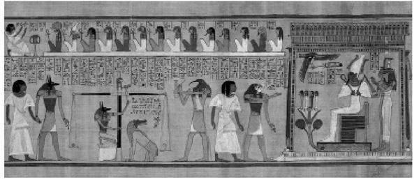 Рис. 1. Слева изображено, как бог Анубис (с телом человека и головой шакала) ведёт почившего на суд, означенный весами, затем подсудимый предстаёт со своим оправдательным словом перед Осирисом. Композиция суда отдалённо напоминает христианскую иконографию, но о непосредственном заимствовании судить сложно: хотя о «Книге мёртвых» и было известно в Средневековье, её содержание смогли дешифровать только в XIX–XX вв. Папирус Хунефера, 1310–1275 гг. до н. э. Лондон. Британский музей. EA 9901.