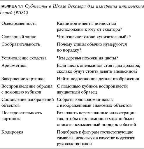 В качестве примера конкретного IQ-теста в таблице 1.1 приведены субтесты шкалы Векслера, которые могут быть предложены детям от 6 до 16 лет. Корреляция между отдельными субтестами в подобных IQ-тестах составляет от 0,3 до 0,6. Наличие такой корреляции отражается в идее о том, что есть некий фактор, соответствующий общему интеллекту; его принято называть g-фактором. (У фактора имеется техническое значение, которое нам нет нужды обсуждать. Сам по себе g-фактор хорошо коррелирует с IQ, хотя и отличается от него в некоторых отношениях, которые не важны для нас в данном случае.)