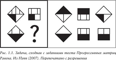 На рисунке 1.1 приведен классический пример задачи на подвижный интеллект. Она взята из так называемых. Прогрессивных матриц Равена. Под словом «матрицы» имеются в виду наборы фигур в заданиях, организованных в виде матриц 2х2 или 3х3. Слово «прогрессивные» отражает тот факт, что задания расположены в порядке возрастания сложности. Первая версия этого теста была опубликована Джоном Равеном в 1938 году.