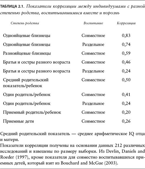 Как же «наследственники» приходят к таким выводам? Взгляните на таблицу 2.1, где собраны данные многочисленных исследований, сравнивающих людей, состоящих в родстве, которые росли либо вместе, либо порознь. Непосредственная оценка наследуемости представлена показателями для однояйцевых близнецов — имеющих идентичный генотип, — которые росли отдельно друг от друга. Она равна 0,74 — и именно на нее опирался Артур Дженсен в своих выводах относительно генетической природы IQ. Поскольку условия воспитания близнецов в данном случае разные, то по логике сходство между ними может быть обусловлено только генетикой (а также пренатальными и перинатальными факторами, которые могли оказывать влияние на близнецов еще до их разделения, однако большинство «наследственников» считает, что этим фактором можно пренебречь).