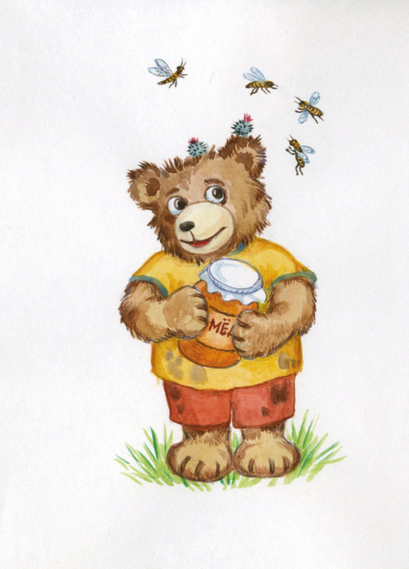Время приближалось к трём часам, поэтому Изюмчик поспешил домой. Умылся, надел лучший костюм, взял пакет с подарком и отправился в гости к белочке. Он шёл, беззаботно насвистывая весёлую мелодию, когда услышал, как трещат, ломаясь, сухие ветки. Через мгновение на тропинку выкатился медвежонок Плюшка. Вид у него был ужасный: шерсть взлохмачена, вся в колючках, шортики и футболка перепачканы не понятно чем. В лапах он держал стеклянную банку с мёдом. За ним летели пчёлы.