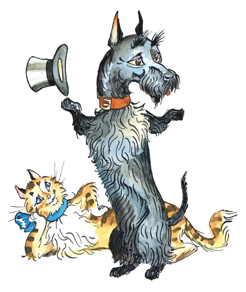 И вот теперь мы живём в Загородном Доме рядом с Парком. Здесь вокруг масса интереснейших запахов. И мы тут все вместе. Нас много. Вы, когда считаете, загибаете пальцы? Ну а я буду загибать лапы. Смотрите: тут живу я и мой Персональный Бог – Хозяин. И ещё Слипперс и его Богиня – Миссис. На этом мои лапы кончаются. А ещё с нами живут Эйдар-домоправительница, Стряпуха, Джеймс с будкой-на-колёсах. Он на ней ездит. И к тому же тут находится Гарри-с-лопатой. На этом и Слипперсовы лапы все вышли. На чём теперь-то считать? Есть ведь ещё Горничные, и Мальчик-на-побегушках, и Почтальон со всякими там письмами и телеграммами, и Мясник (самый замечательный человек), и вообще полным-полно-всякого-народу. А ещё на кухне живёт Кошка, которая одним духом может взлететь на стену в саду. Дрянь! Дрянь! Дрянь!