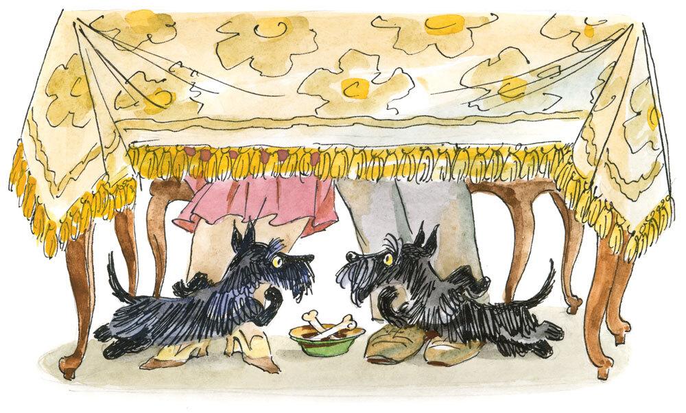 Если идёт дождь, мы лежим на каминных ковриках возле горящего камина. Или бывает так: «С-чего-это-вы-взяли-что-собакам-можно-валяться-на-стульях?»