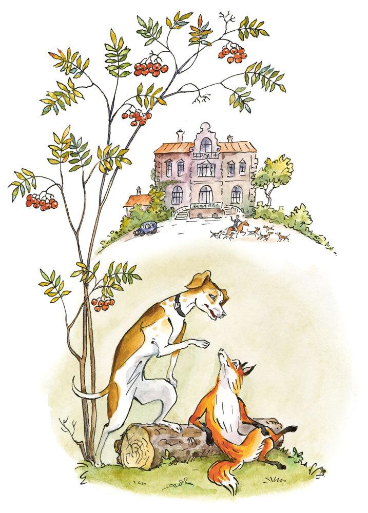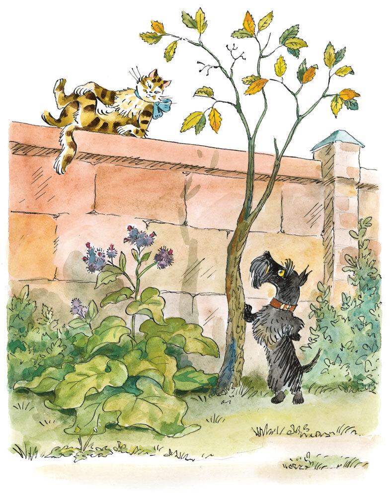 После завтрака наступает час охоты на Кошку, пока она в конце концов не вскочит на высокую садовую стену. Она там сидит, а мы сидим внизу, глядим на неё, поскуливаем и ждём, когда наши Боги отправятся на прогулку. Прогулки бывают разные. Если у Него и у Неё на голове нет шляпы, то прогулка будет так себе, только по саду, и всё время: «А-ну-ка-марш-с-цветочной-клумбы-быстро!»