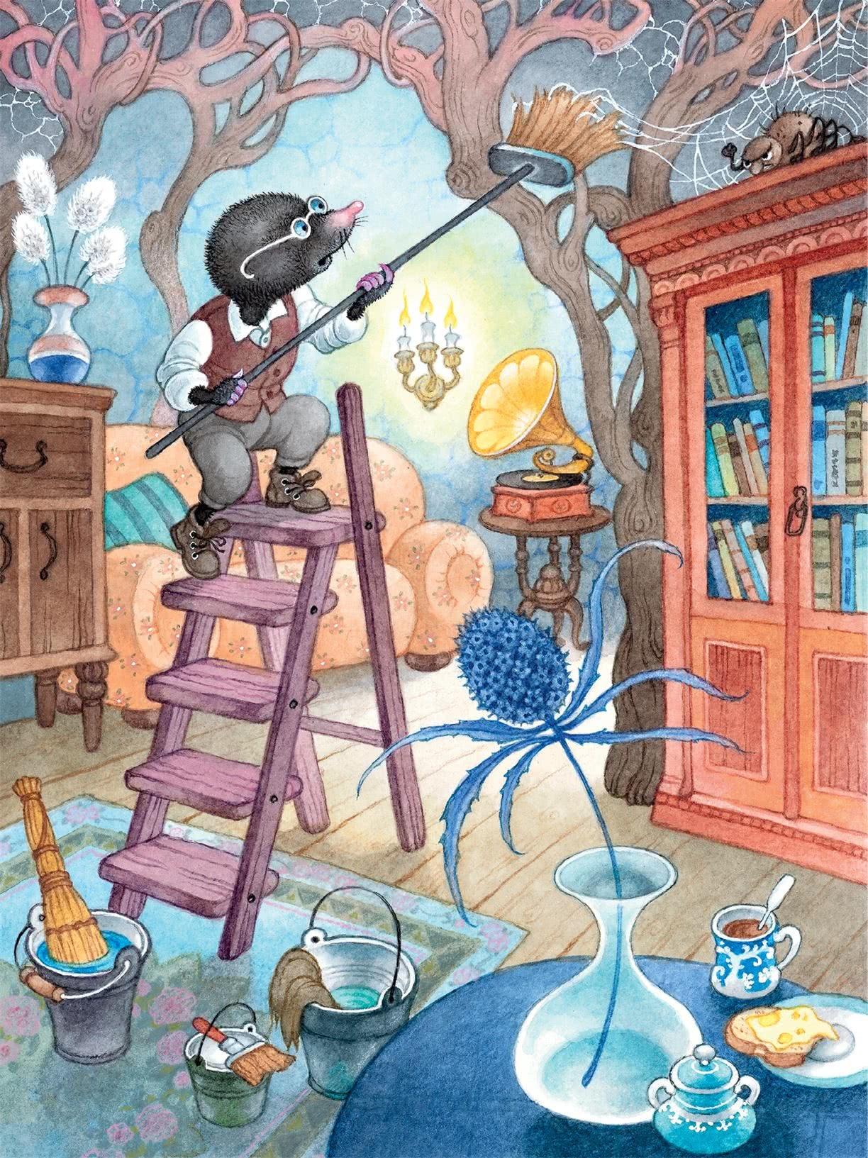 Крот ни разу не присел за всё утро, потому что приводил в порядок свой домик после долгой зимы. Сначала он орудовал щётками и пыльными тряпками. Потом занялся побелкой. Он то влезал на приступку, то карабкался по стремянке, то вспрыгивал на стулья, таская в одной лапе ведро с извёсткой, а в другой – малярную кисть. Наконец пыль совершенно запорошила ему глаза и застряла в горле, белые кляксы покрыли всю его чёрную шёрстку, спина отказалась гнуться, а лапы совсем ослабели.