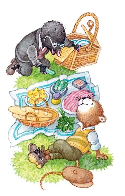 Крот попросил разрешения распаковать корзинку, на что дядюшка Рэт охотно согласился. Он с большим удовольствием растянулся на травке, в то время как Крот с воодушевлением выудил из корзинки скатерть и расстелил её на траве, потом один за другим стал доставать таинственные свёртки и разворачивать их, каждый раз замирая и восклицая: