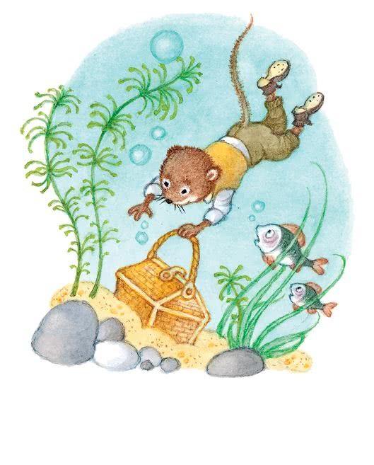 Тем временем дядюшка Рэт опять вошёл в воду, доплыл до опрокинутой лодки, перевернул её, привязал у берега и по частям выловил своё скользящее по волнам имущество. Затем он нырнул на самое дно и, отыскав корзину, не без труда вытащил её на берег.