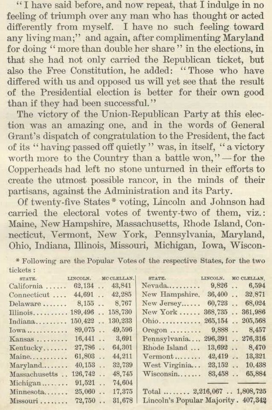 Of twenty-five States voting, Lincoln and Johnson had carried the electoral votes of twenty-two of them, viz.: Maine, New Hampshire, Massachusetts, Rhode Island, Connecticut, Vermont, New York, Pennsylvania, Maryland, Ohio, Indiana, Illinois, Missouri, Michigan, Iowa, Wisconsin, Minnesota, California, Oregon, Kansas, West Virginia, and Nevada; while McClellan and Pendleton had carried the twenty-one electoral votes of the remaining three, viz.: New Jersey, Delaware, and Kentucky—the popular vote reaching the enormous number of 2,216,067 for Lincoln, to 1,808,725 for McClellan—making Lincoln's popular majority 407,342, and his electoral majority 191!