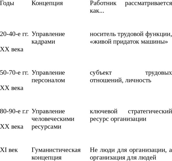 Если управление персоналом базировалось на представлении о работниках как о некой совокупности профессиональных способностей, то современная концепция управления человеческими ресурсами рассматривает людей как ключевой ресурс и социальную ценность и обосновывает целесообразность стратегического, инвестиционного подхода к их формированию, использованию и развитию подобно другим видам ресурсов. Работник считается не просто позицией в штатном расписании, а выступает в единстве трех взаимосвязанных компонентов: трудовой функции, социальных отношений и личности.