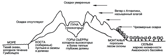 Повсюду на территории Анд климат зависит не столько от высоты над уровнем моря, сколько от удаленности от экватора. Хотя туман образуется над всем побережьем, обычно дождей здесь не бывает. Влага удерживается в воздухе, а выпадает в горных районах – в виде незначительных осадков и интенсивных – в зоне джунглей (см. рис. 2).