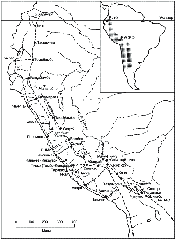 Развитие событий в Андском регионе, приведшее в конечном счете к господству инков, может стать понятнее после краткого рассмотрения географических характеристик этой земли. Мы будем рассматривать ту часть Южной Америки, которая находилась под управлением инков к концу XV в. и перед испанским завоеванием в 1532 г. Эта территория охватывает Перу, Эквадор, Боливию, северо-запад Аргентины и большую часть Чили к северу от реки Мауле. Столица инков, Куско, самое сердце страны, располагалась в перуанском высокогорье (см. рис. 1).