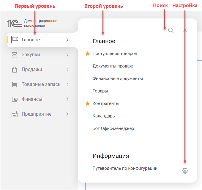 Главное меню состоит из двух уровней. На первом уровне находятся разделы приложения, отражающие его основную функциональность.