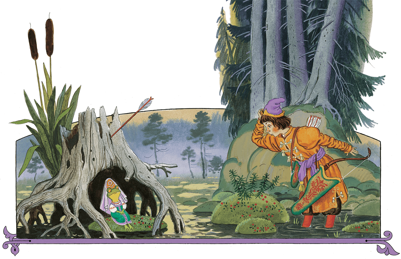 Пустил стрелу старший брат – упала она на боярский двор, прямо против девичьего терема. Пустил средний брат – полетела стрела к купцу на двор и остановилась у красного крыльца, а на том крыльце стояла душа-девица, дочь купеческая. Пустил младший брат – попала стрела в грязное болото, и подхватила её лягуша-квакуша.