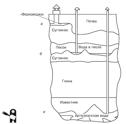 Рис. 1.1. Водоносные горизонты: а – первый водоносный горизонт («верховодка»); б – второй водоносный горизонт (межпластовые грунтовые воды); в – третий водоносный горизонт (артезианские воды)