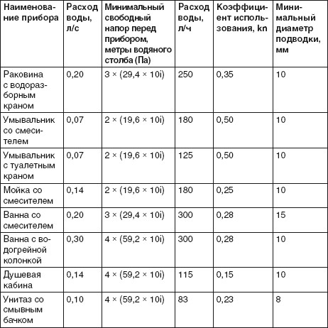 С помощью вышеприведенных данных определяются расход холодной воды, требуемый при таком расходе свободный напор воды перед точкой водоразбора, а также минимальные диаметры водопроводных труб-подводок к точкам водоразбора. Следует также знать, что свободный напор воды над поверхностью земли у ввода в дом должен составлять 10 м водяного столба при одноэтажном здании, если же этажей больше, то на каждый этаж добавляется по 4 м водяного столба.