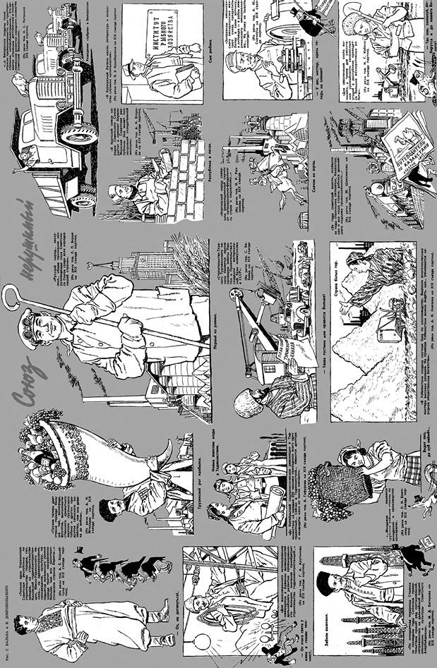 Например, в «Крокодиле» начала 1950‑х сознательно подчеркивается созидательная и культуртрегерская функция русских: они побеждают силы природы, оборачивают вспять реки, строят Главный Туркменский канал (13/1951) [49], канал Волга — Дон (16/1952), сеют саксаулы с самолетов в пустыне (07/1952). Русский обозначен как «Первый из равных» (30/1952) в развороте «Союз нерушимых» Г. Валька и В. Добровольского.