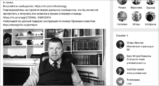 Преимущество такого формата в том, что люди сразу видят создателя и вовлекаются. При переходе в группу такое видео включается автоматически, если «залито» непосредственно в ВКонтакте, а не стоит ссылкой на YouTube. Если вы харизматичны, то одним роликом уже можете привлечь первых клиентов. Впрочем, есть и обратная сторона: плохое видео, где человек говорит неуверенно, постоянно оговаривается и в целом выглядит неубедительно, может, наоборот, отпугнуть. Детально рассказать о сообществе можно и без записи видеообращения. Если вы не уверены в своих способностях, лучше остановиться на текстовом формате. Но, по моим наблюдениям, по сравнению с видео эффективность текста ниже.