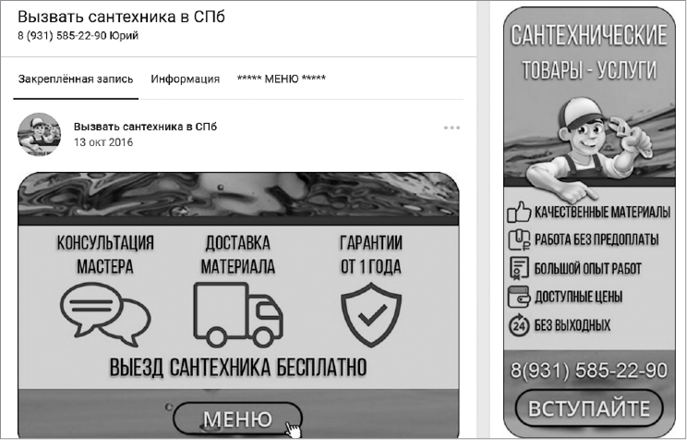 Совсем убирать вики-меню из формата закрепленных постов я бы не стал. Просто сейчас, с моей точки зрения, это самый слабый вариант. Но если вы его выбрали, то не забудьте поставить на «входную» картинку ваше УТП или оффер, точно так же как на предыдущих шагах вы ставили его на обложку или в статус. Вот как выглядит вики-меню у сантехника (рис. 23).