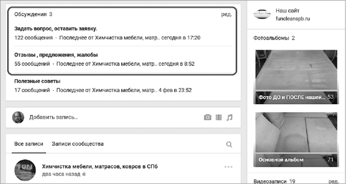 Если вы продаете товары или услуги, то в блоке обсуждений у вас обязательно должно быть минимум три темы: «Оставить заявку (сделать заказ)», «Ваши вопросы», «Отзывы». В интернет-магазинах стоит добавить информацию об оплате и доставке. При этом постарайтесь сделать так, чтобы темы обсуждений не оставались пустыми, иначе у пользователей может возникнуть страх «первого вопроса». Заполните их хотя бы немного (рис. 24).