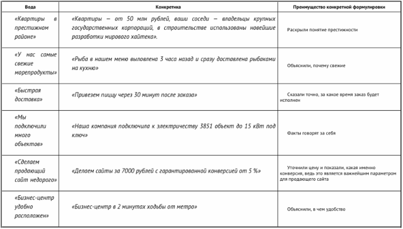 Когда будете прописывать свое УТП, будьте предельно конкретны. Не лейте воду про «мы самые лучшие, с отличным сервисом». Формулировки, которые вы используете, должны объяснять языком цифр и конкретных деталей, почему именно вы претендуете на звание лучших. Это правило стоит распечатать, повесить у себя над рабочим столом и смотреть на него каждое утро.