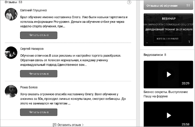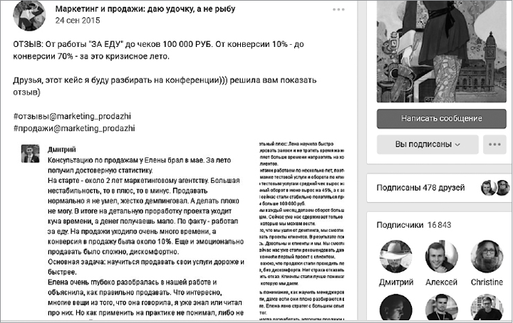 Так, например, поступила Елена Коварская в своем сообществе «Маркетинг и продажи: даю удочку, а не рыбу». Этот отзыв висит в ее сообществе уже пару лет и, конечно, генерирует клиентов (рис. 20).