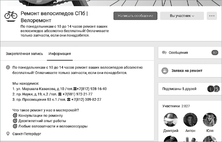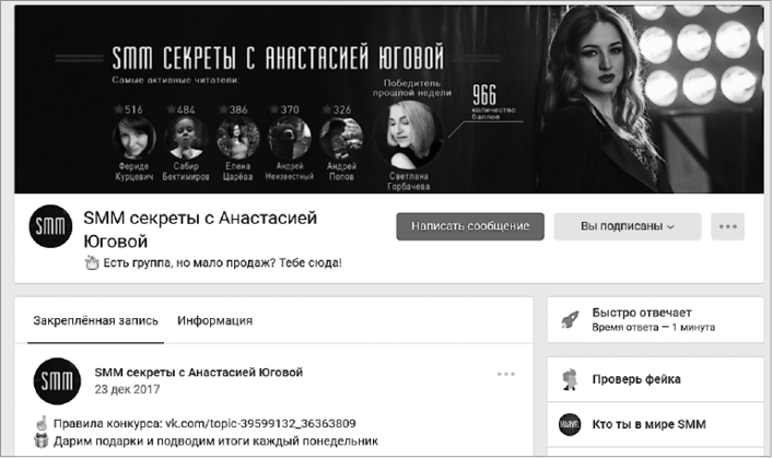 На обложке имеет смысл указывать то же самое, что и в статусе: УТП, оффер, социальное доказательство, контакты. Например, сервис может написать, какое количество пользователей у него или сколько сделок было совершено за последний месяц. Существует такая разновидность обложек, как динамические обложки. На них данные могут меняться в режиме реального времени. Например, вы можете разместить в этой области таймер, ведущий обратный отсчет времени до конференции. Или, как это стали делать в последнее время, показывать участников с самой высокой активностью в группе (рис. 17).