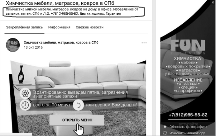 Единственный минус — ограничение по символам: их может быть не более 140. Но и этого достаточно, чтобы заявить в нем свое УТП или ключевой оффер, социальные доказательства, телефон для связи или ссылку на личные сообщения (сокращенную через vk. cc, чтобы сэкономить символы).