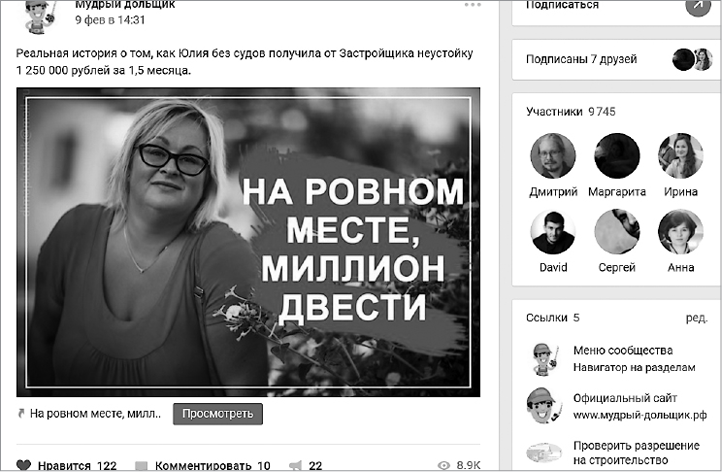 Давайте рассмотрим конкретный пример. В моей практике был проект по продвижению юристов в сфере долевого строительства. Они начинали с полного нуля — у них не было даже сайта. Первые клиенты только появлялись, поэтому в закрепленном посте было лишь вики-меню. Постепенно юристы стали получать и результаты. И наконец появился кейс, где клиент с их помощью получил неустойку от застройщика в 1,2 млн рублей. Его тут же оформили и закрепили. Через пару дней количество обращений в личные сообщения сообщества выросло на 20 % (рис. 18).