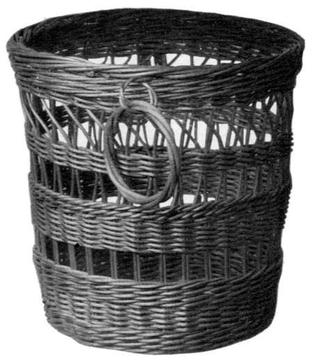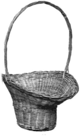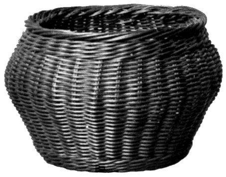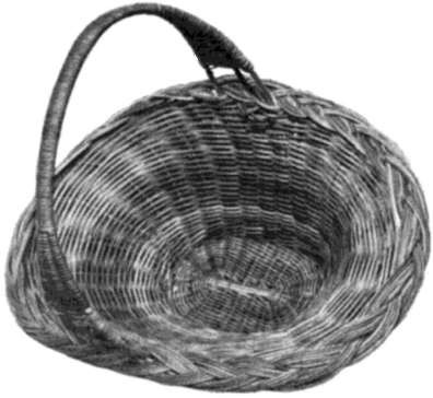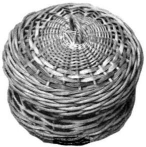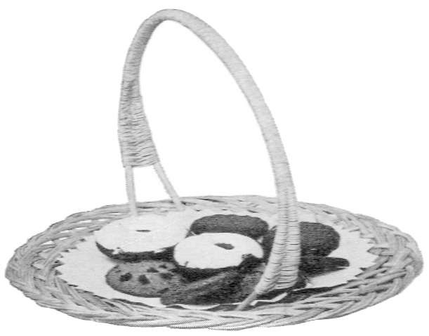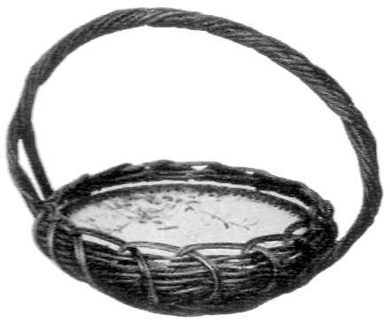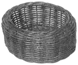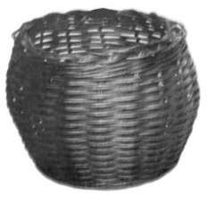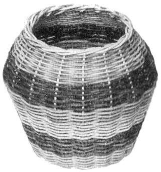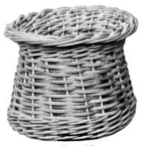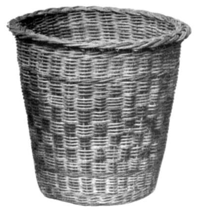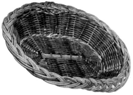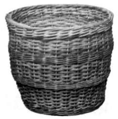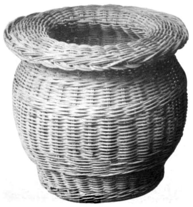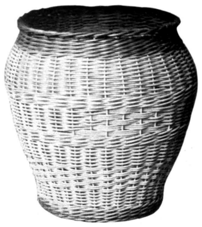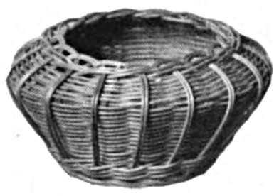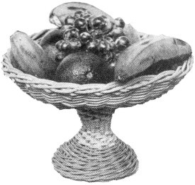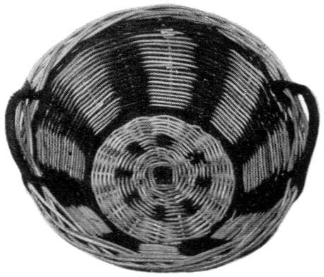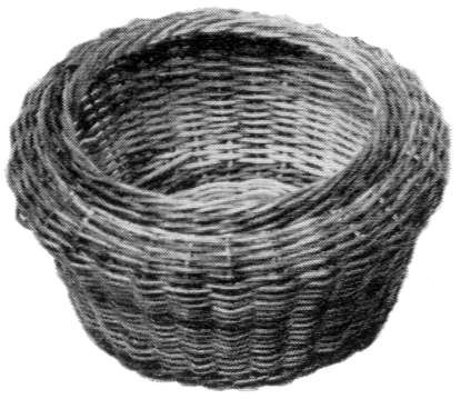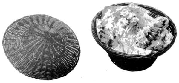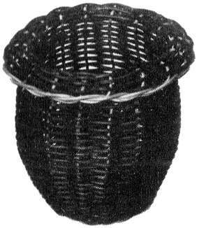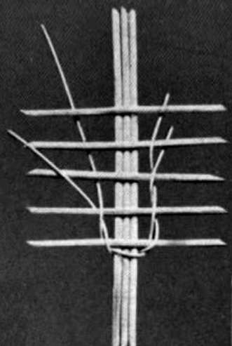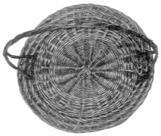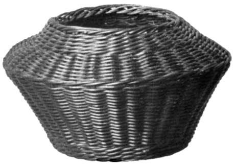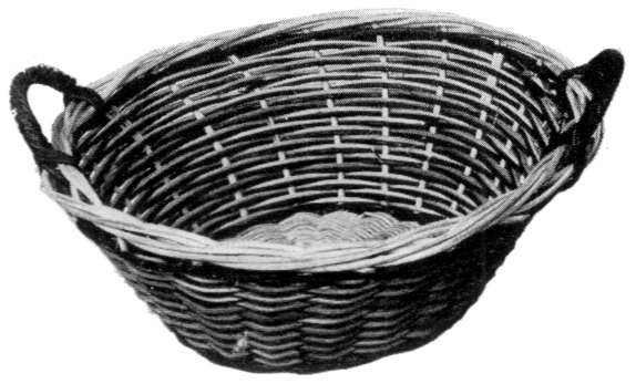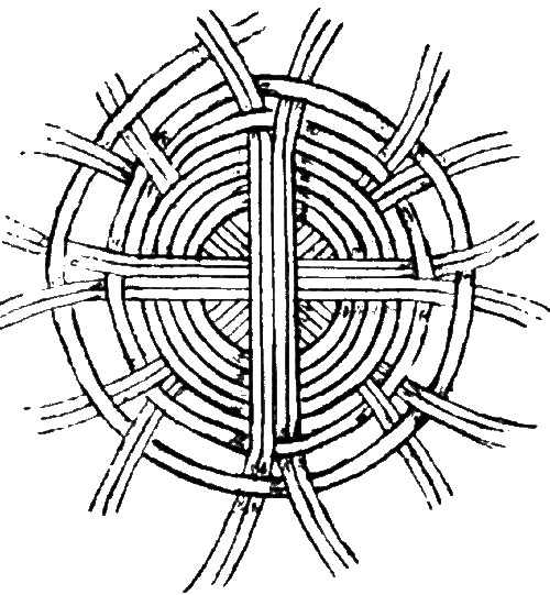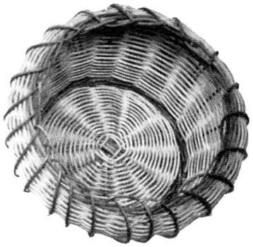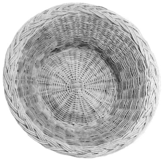 Make a round base seven inches in diameter. Insert the 62 spokes, placing two spokes each side of the base spokes. Weave two rows of triple twist. Turn the spokes sharply upward, weave four rows of triple weave and eight rows of plain weave. Insert three weavers and work two rows of triple.