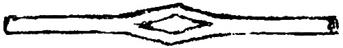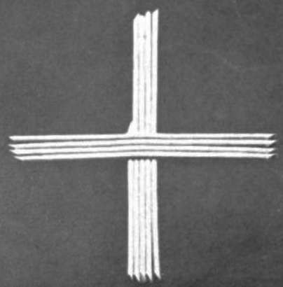 Take two pieces of the 15 inch spokes and weave as 1 spoke, one row in simple weaving. Now insert a strand of No. 2 reed and make eleven rows simple weaving, working the first row under and over the same spokes as the two 15 inch spokes are woven.