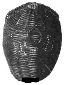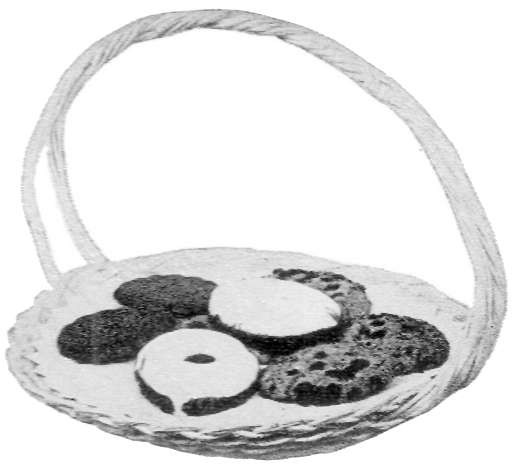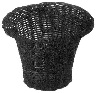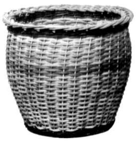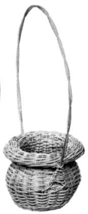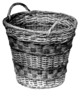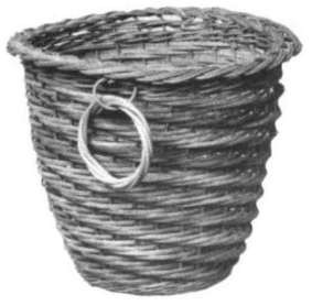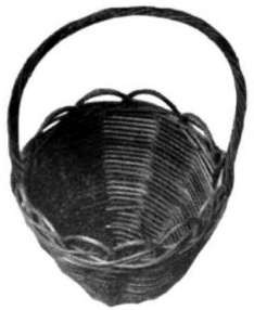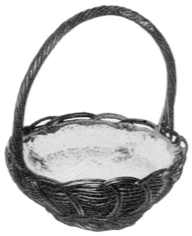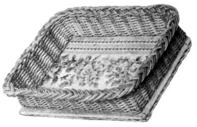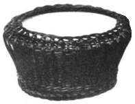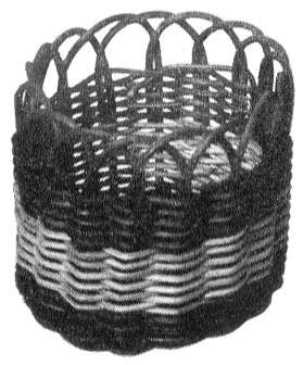 Make a seven inch base No. 4 reed. Insert the 31 spokes and turn up with five rows of upsetting No. 5 reed. Weave fifteen rows single weaving. Insert four weavers and work four rows, each weaver passing in front of three spokes and back of one spoke. From the beginning hold the spokes outward. In plain weave, work twenty-six rows. Wet the spokes well now and bend them in. Introduce three weavers and work three rows of triple twist. Drop two weavers and work eleven rows in plain weaving. The weaver should be drawn tightly from now on. Weave two rows in 3-rod coil. Drop two weavers and work sixteen rows in plain weaving. Wet the spokes again and with the plier press the spokes well and bend them outward for a slight flare. Work seventeen rows in plain weave. Bend the spokes down and make three rows of triple twist No. 5 reed. Finish with the following border: