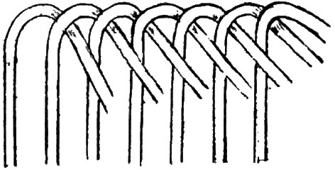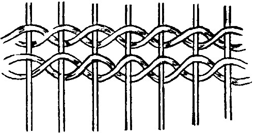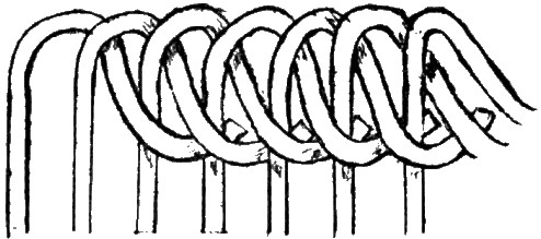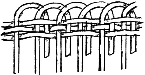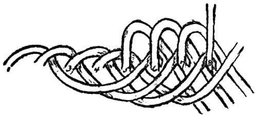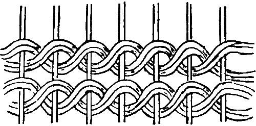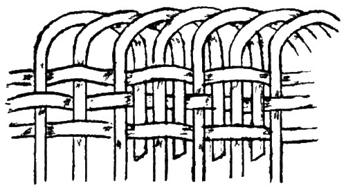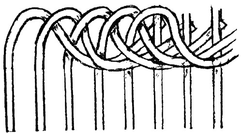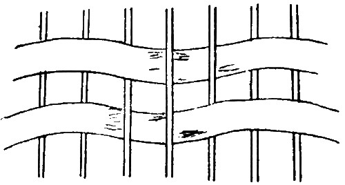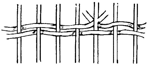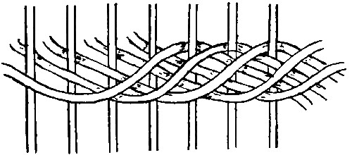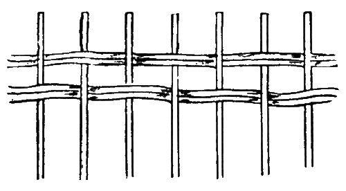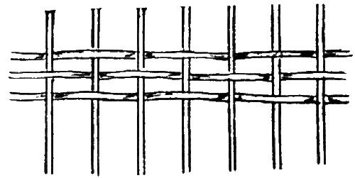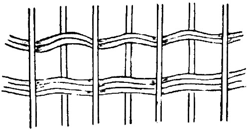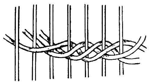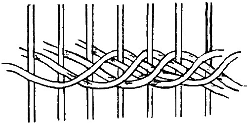 Soak the rush a few minutes in cold water and with it work fourteen rows in single weaving. Where any ends of rush are joined sew them carefully with fine raffia.